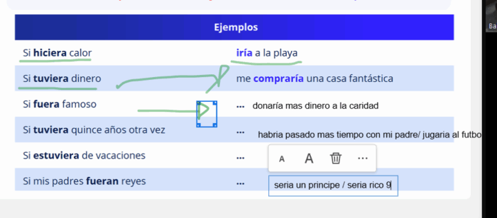 10 frases como las del ejemplo; @babak-amouzandeh Por ejemplo; si tuviera dinero, me compraría una casa grande.
